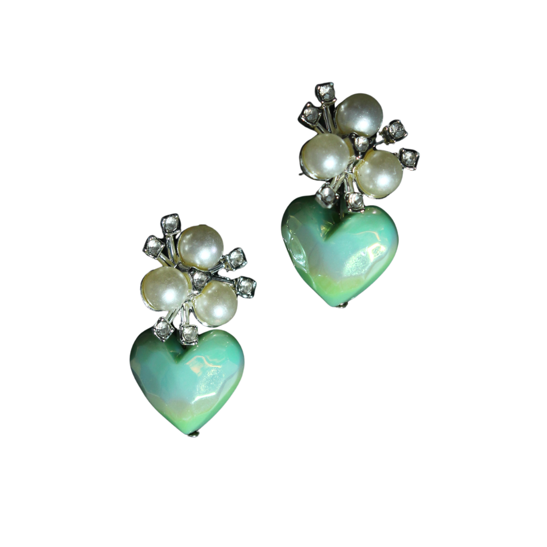 Playful meets elegant in these Pearl Cluster Green Heart Drop Earrings.